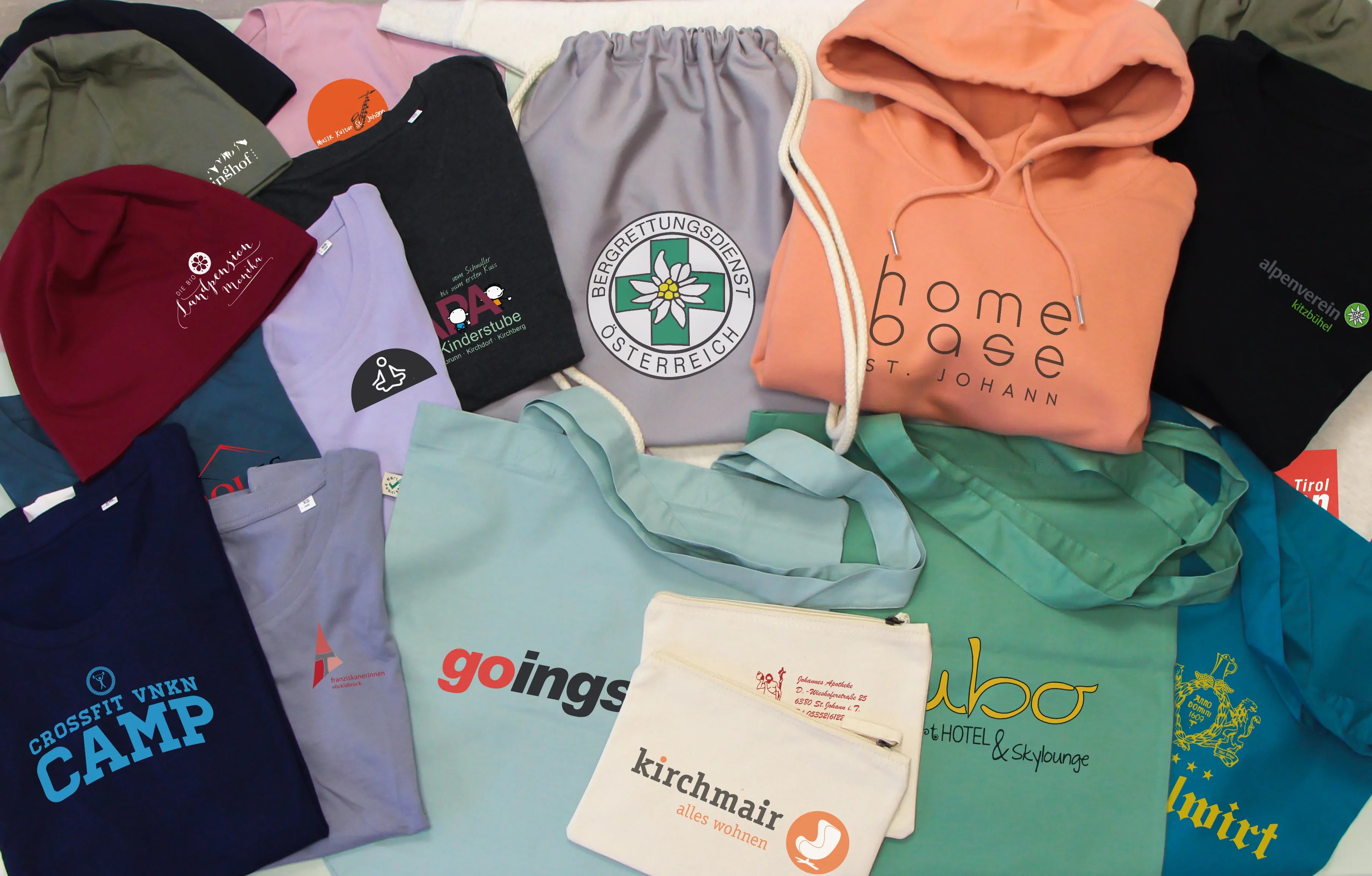 z.B. Polyester, Mischgewebe, Sportbekleidung, Funktionsbekleidung, Arbeitsbekleidung, Warnwesten, Turnbeutel und Caps